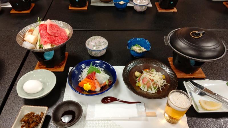 夕食はグラウンドゴルフ大会の表彰式を兼ねた会食。すき焼きやアワビのステーキなど